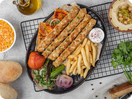 Grilled chicken meal with rice, tahini salad and bread
